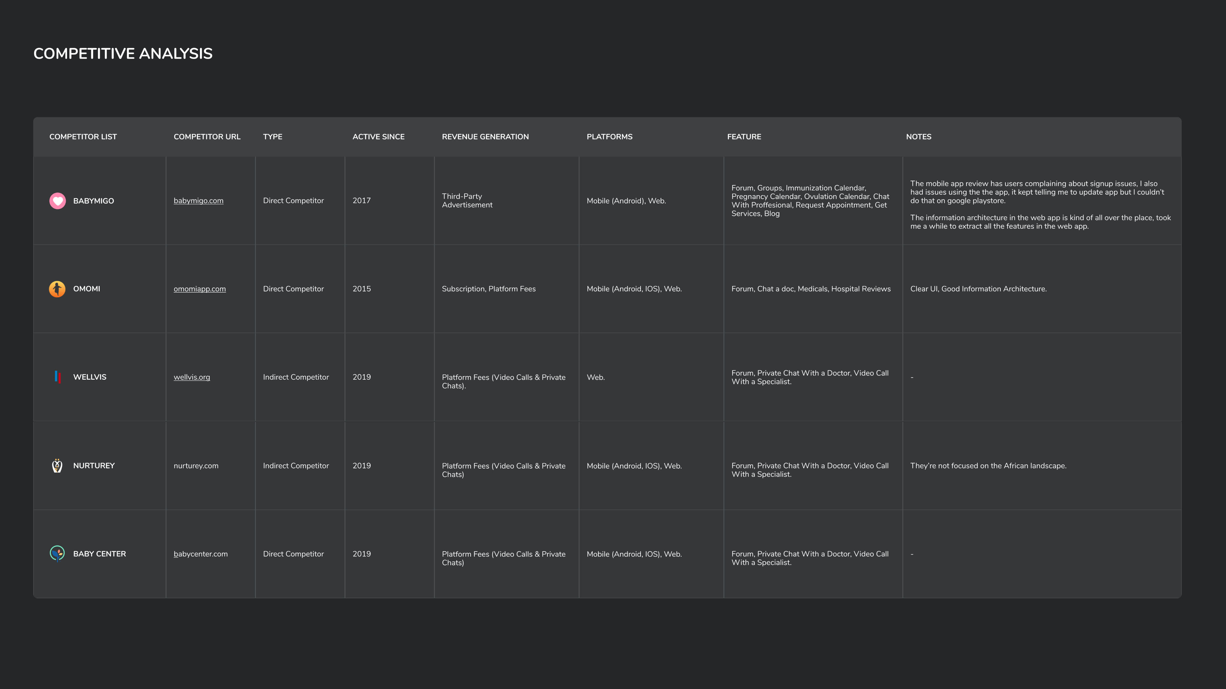 The next step was to research what products our target users currently use to solve the same problem. From my research, Jojolo's direct competitors are Babymigo, Babycenter, and Omomi. These apps cater to the same audience and have similar selling points. The whole point was to understand Jojolo’s competitors' strengths and weaknesses and to find a gap in the market.