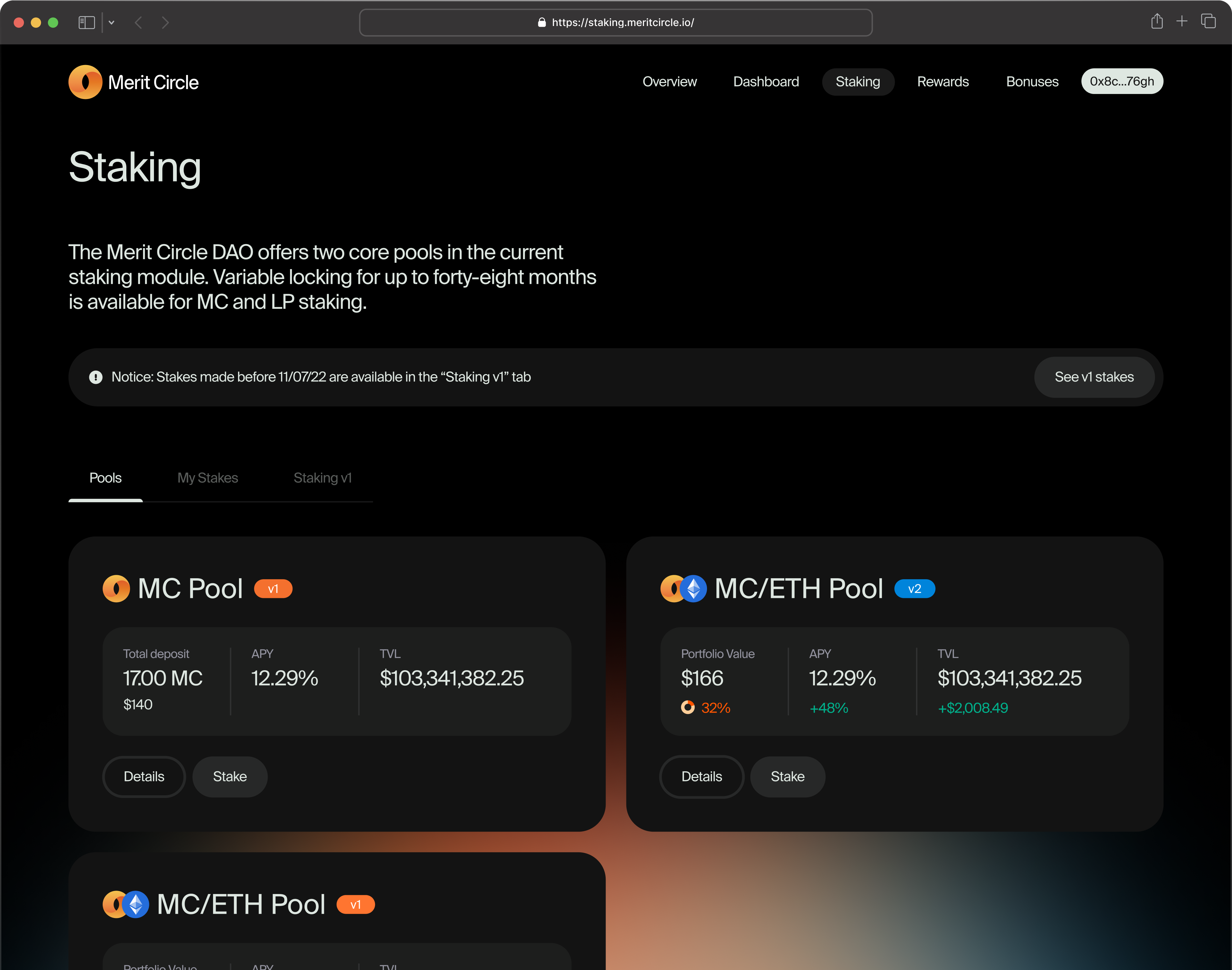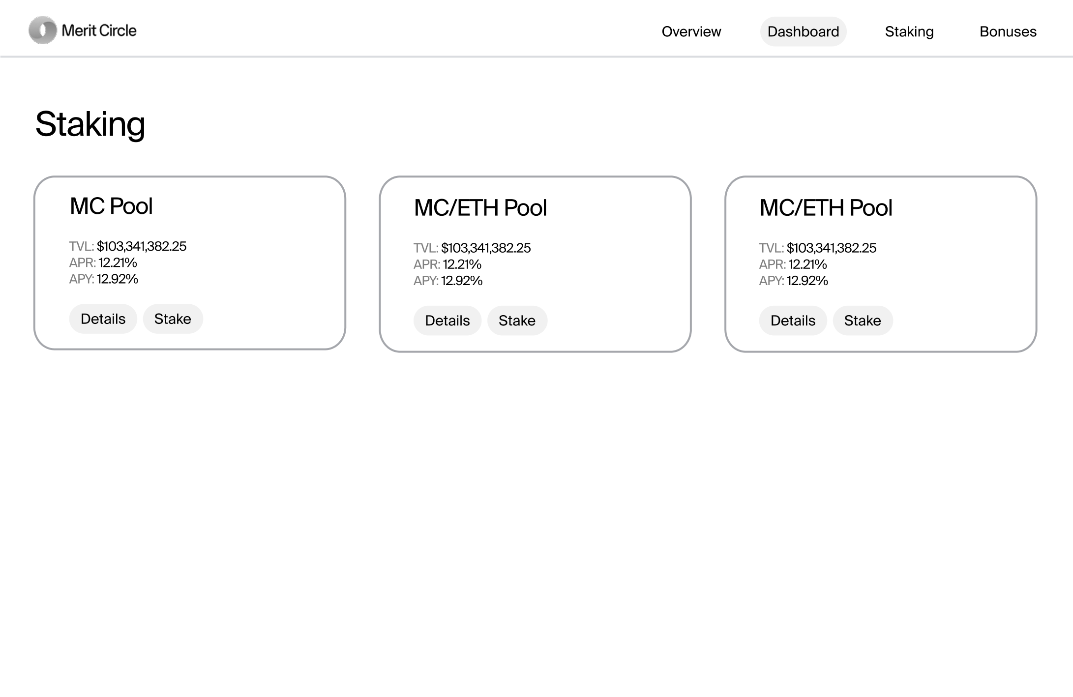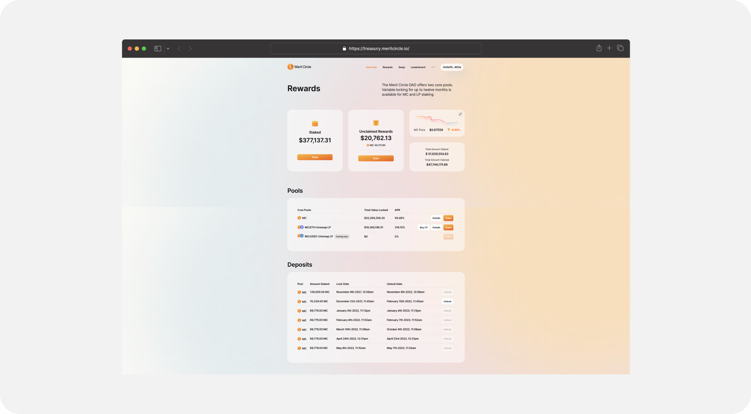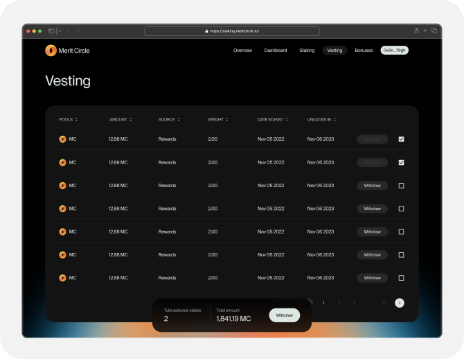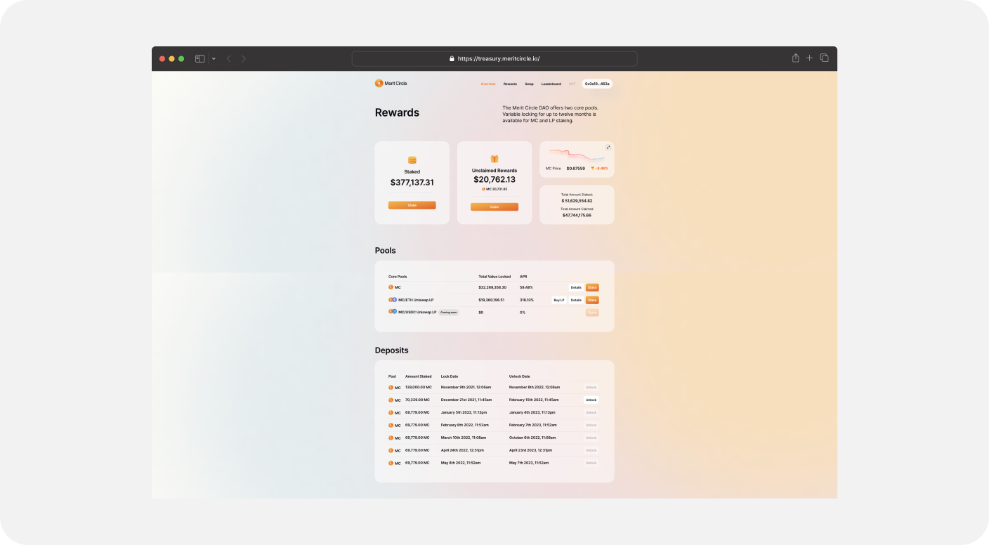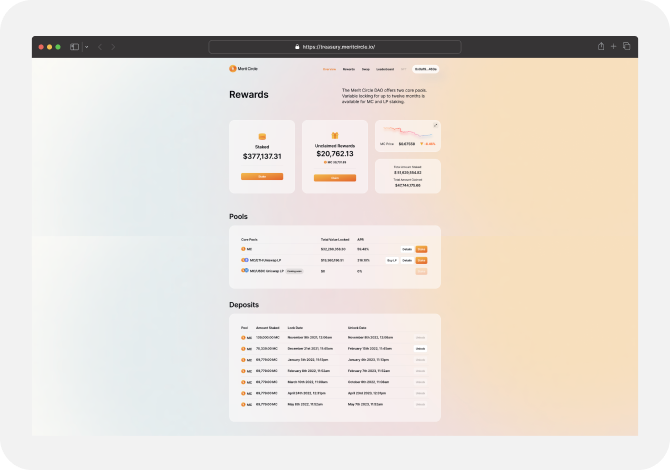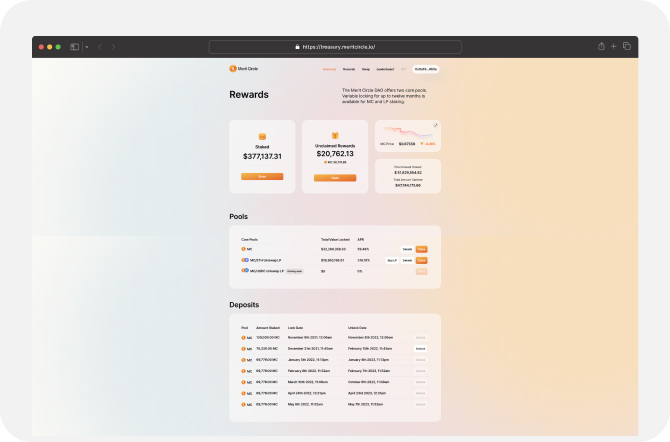 The staking page introduces users to the available staking platforms that will give them the freedom to stake within Merit Circle's ecosystem. Users can effortlessly evaluate all the lists of pools that are ready for staking MC tokens, and determine the best staking options from this list to increase their staking profits.