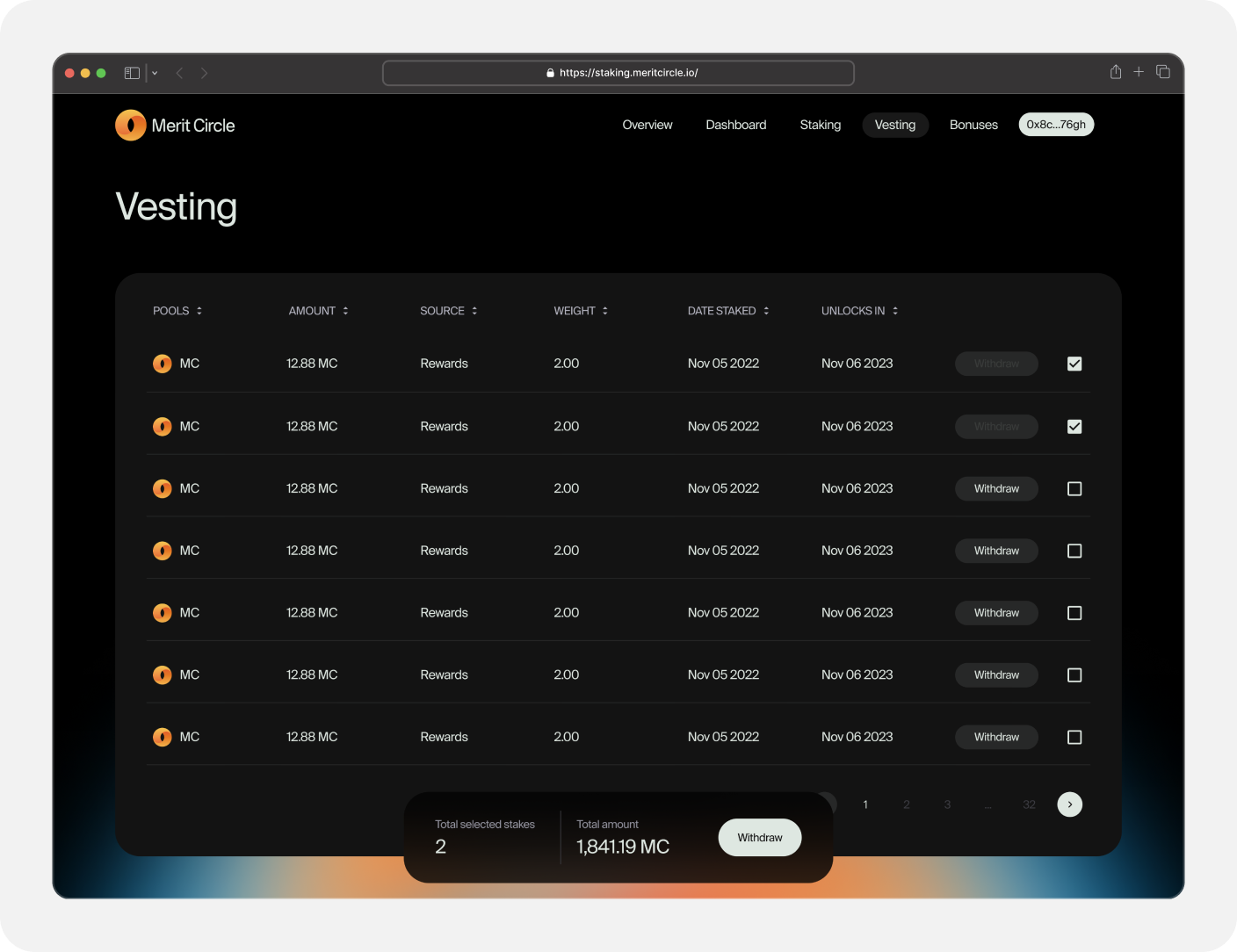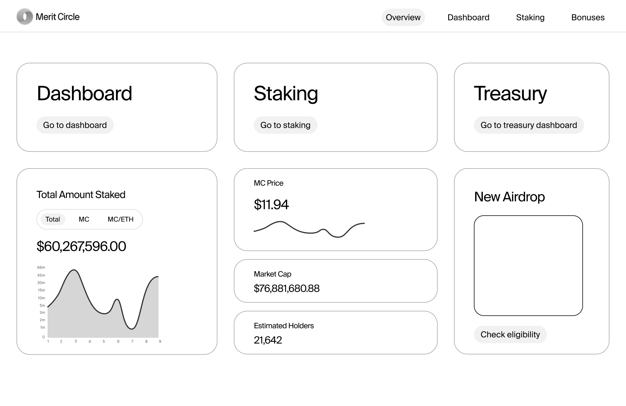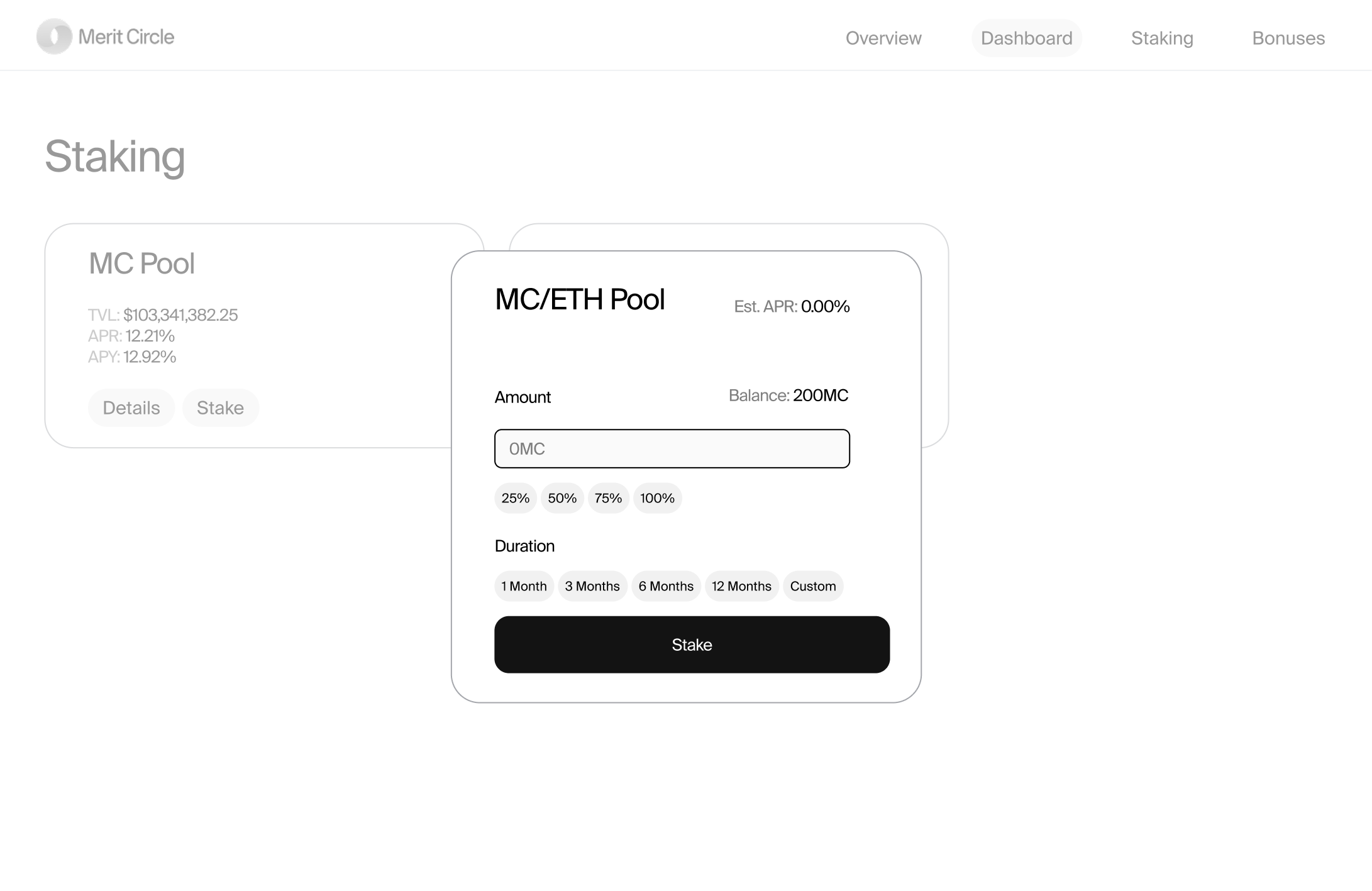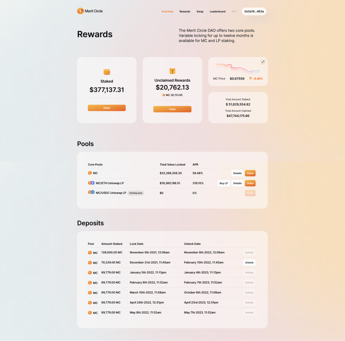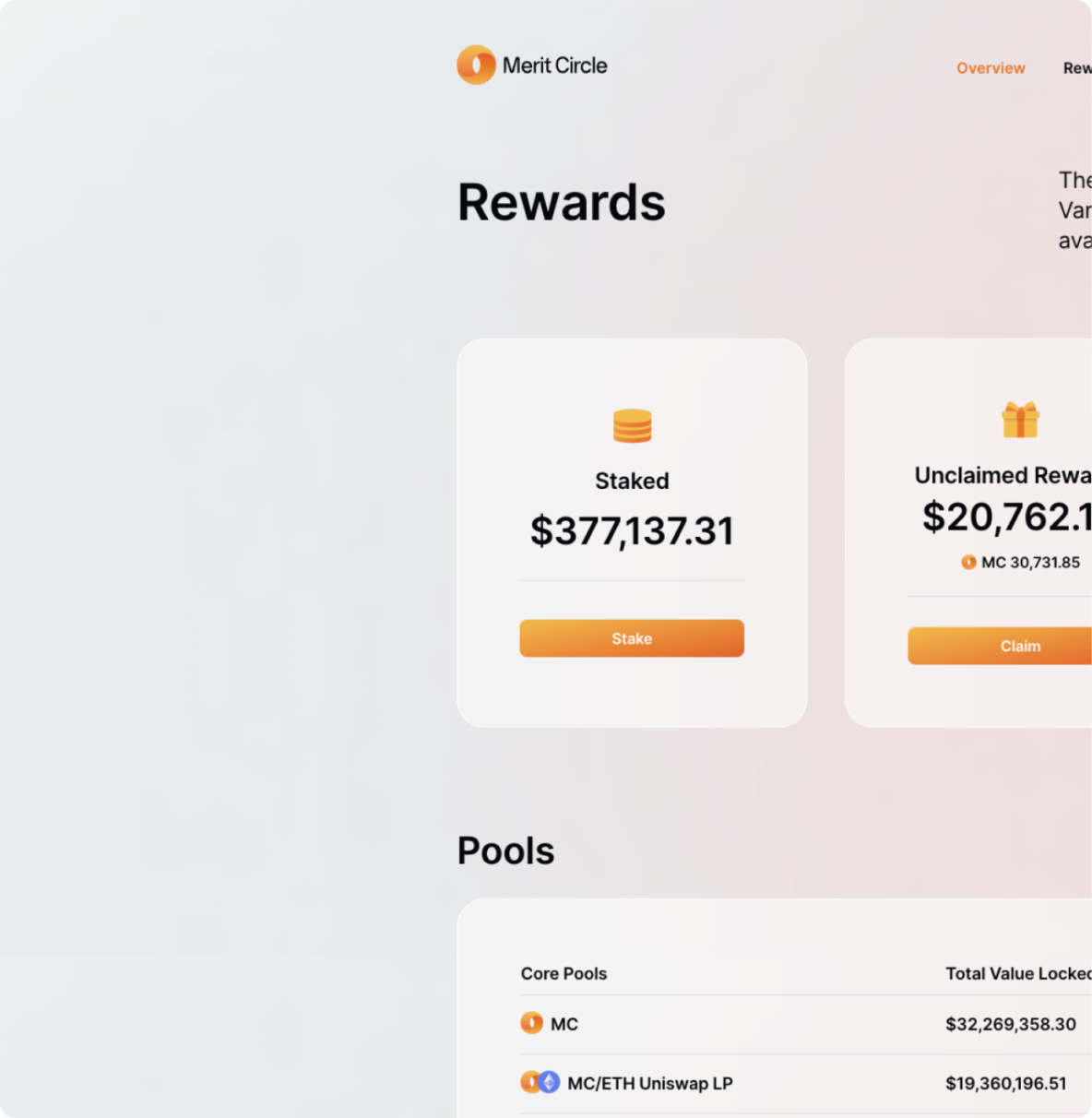The staking page introduces users to the available staking platforms that will give them the freedom to stake within Merit Circle's ecosystem. Users can effortlessly evaluate all the lists of pools that are ready for staking MC tokens, and determine the best staking options from this list to increase their staking profits.