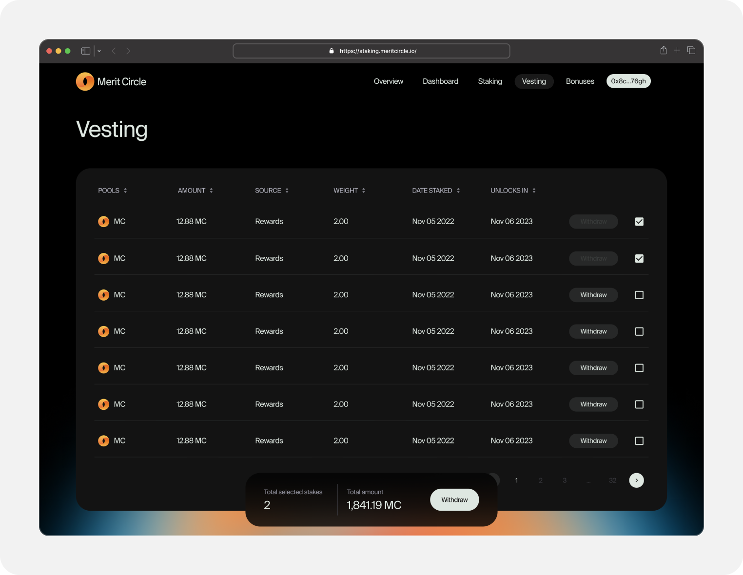 This necessitated a reassessment of the entire vesting page concept. We subsequently devised a different solution, incorporating a single button for claiming all vestable tokens, information on locked rewards, and a more comprehensive overview in general.